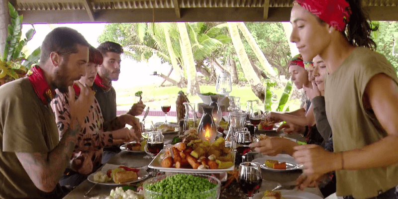 The new Contenders tribe enjoys a feast reward. On the left (from L to R): Heath, Fenella and Robbie. On the right: Lydia