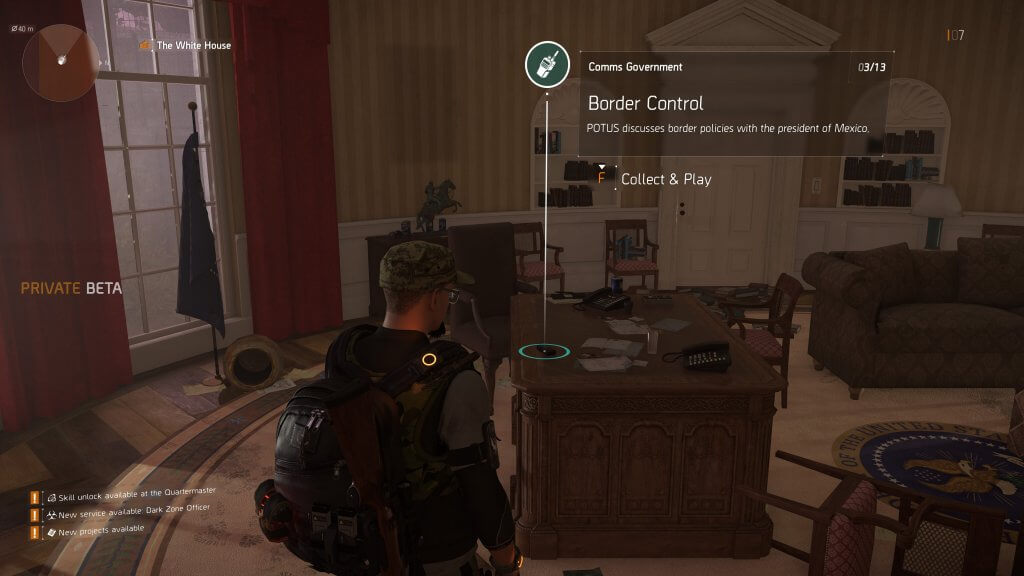 Once inside I find myself with the same song and dance from the first Division; Gather, kill bad guys and save NPC’s. Build up the White House’s staff and resources, etc. The skill tree is pretty much the same, although not all of the skills available in the first game were available to use, sadly. But what really makes it different this time around, is that instead of having safe houses and JTF patrols, there’s control points that you have to capture, and civilian patrols. But the cool thing is that I can call in NPC’s to help!